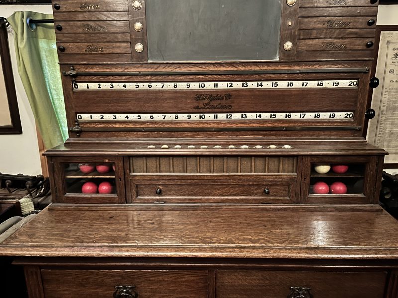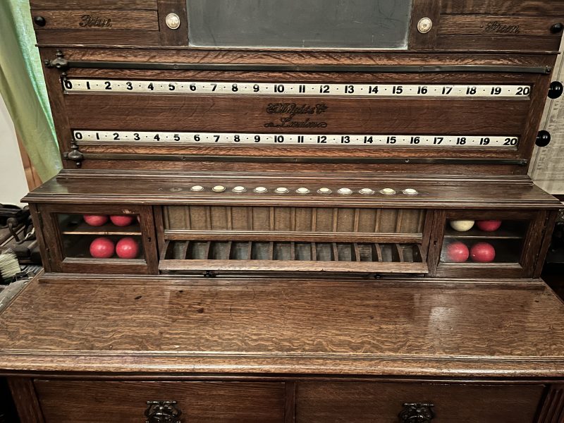 Antique George Wright oak cabinet scoreboard