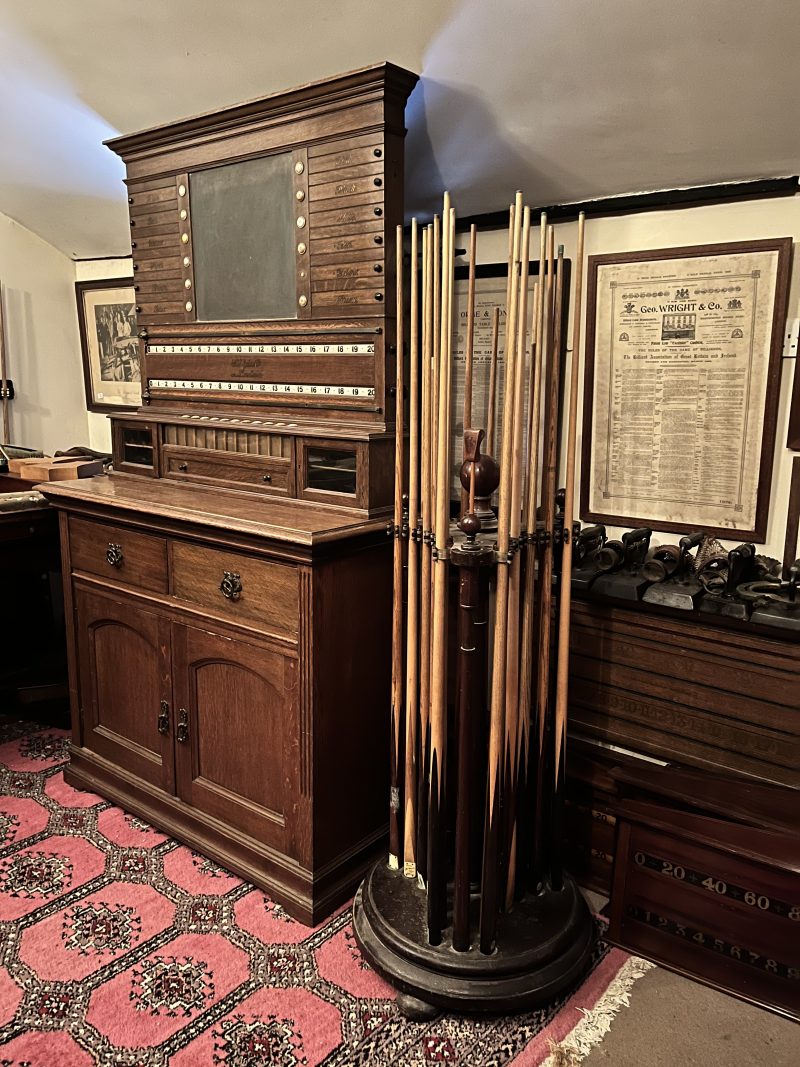 Antique 1/4 Sawn English Oak cabinet scoreboard, made by George Wright & Co of Westminster Bridge Road, London C.1890. The scoreboard features 100 up rollers with lovely aged brass rails & pointers for marking billiards or snooker, a central chalk board, and Life Pool sliders with mother of pearl inlays & boxwood ebony stars. The scoreboard sits on parallel glazed ball cupboards that store 16 balls each and a glazed drawer with penny shoots to retrieve the ‘stakes’ that were wagered during the game of pool. The cabinet features 2 drawers and arched panelled cupboard doors underneath, with a fluted design flanking the doors, a lovely moulding at the base, original decorative brass handles and a pediment to the top.