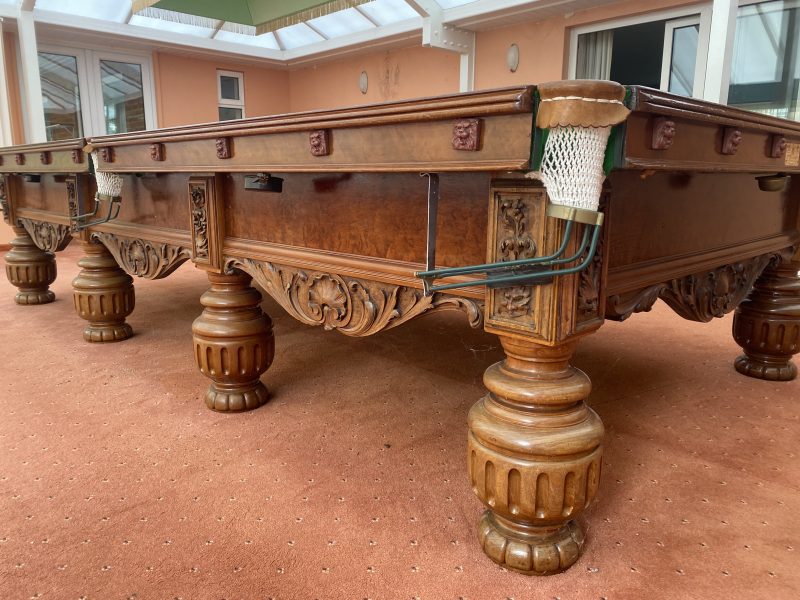 A stunning victorian walnut 12ft snooker table by George Wright & Co of Westminster Bridge Road, London. Standing on 8 huge turned and carved legs and dating from 1894, this table boasts gorgeous grains thanks to its use of the finest cut of Walnut. The frame features decorative carved scrolls of scallop shells and carved gargoyle knee panels. The cushion buttons are Lion’s heads and the frame supports a 2″ thick bolted welsh slate.