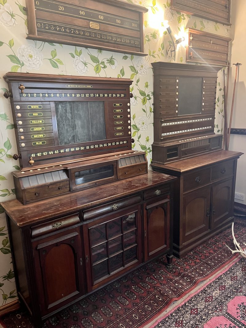 Antique Victorian John Taylor mahogany life pool combination cabinet scoreboard