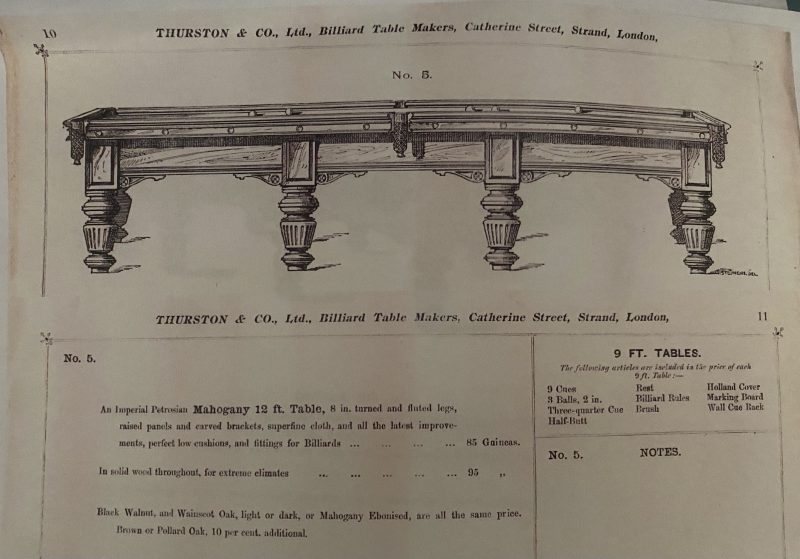 An antique Victorian full size snooker table manufactured by Thurston of 14 Catherine Street, Strand. The table is design no.5 and features tapering turned and fluted legs with carved scrolls on the frame. The table boasts gorgeous 1/4 sawn English Oak legs, frame and cushions, and the frame supports a 1 & 1/2″ Welsh Bolted Slate bed. The frame features Ebonised flutes, banding and moulding which came be taken back to natural oak if desired, or restored to contrast the honey colour.
