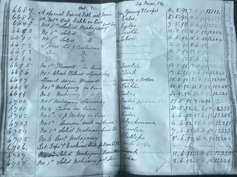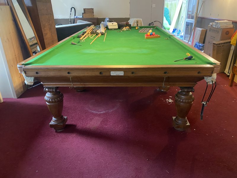 A beautiful Victorian oak full sized billiard/snooker table, made by Thurston & Co of 16 Catherine Street, dating c.1892. The table number is stamped 6687, and shown is a copy of the Thurston ledger showing that table number 6687 (top) dates 4/5/1892, describing the table as ‘A special carved oak table with thurstonic cushions, to be made by coveted makers Gowing & Cooper’
