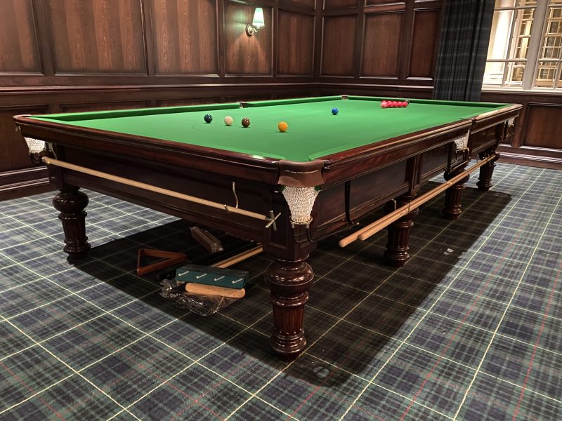 An Edwardian mahogany full sized snooker table, made by Burroughes & Watts, dating from the 1900’s. This table stands on 8 medium turned and fluted legs, and comes with steel blocked cushions and welsh slates.