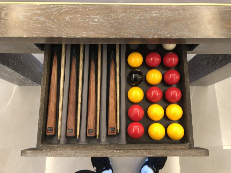 Contemporary English pool table in limed oak, standing on four solid oak legs. Shown here in 8ft with ball and cue storage drawer, 6ft, and finally with reversible dining and table tennis tops.