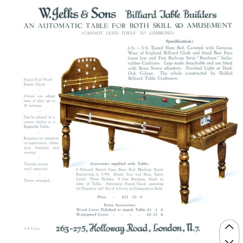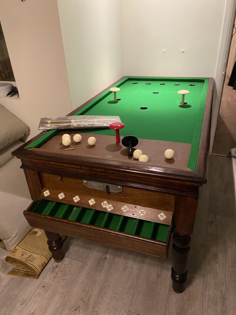 An original Jelks bar billiard table circa 1930, with original slate bed and clockwork mechanism. Price includes full restoration and new accessories, and delivery to England or Wales.